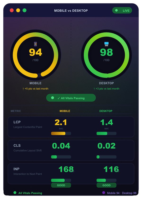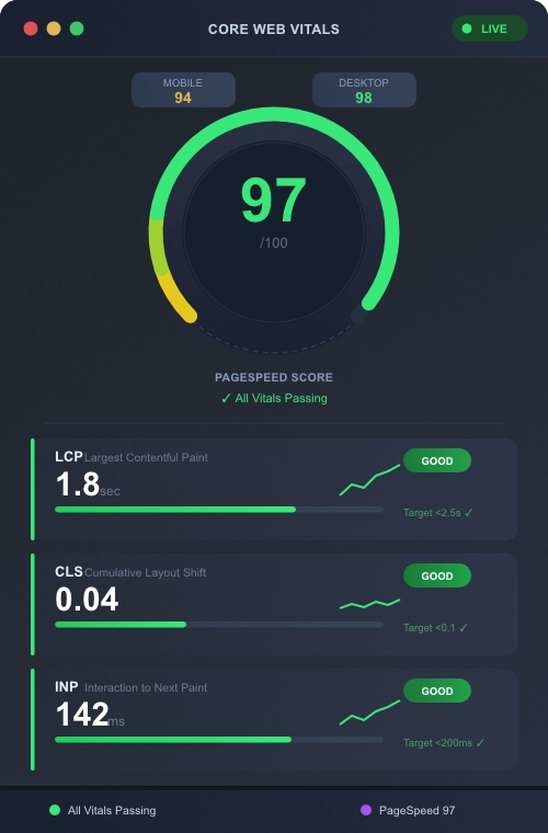 Explore SEO & MoreGoogle uses Core Web Vitals as a ranking signal. Every site we host is tuned for LCP, CLS, and INP out of the box — no plugin tweaks, no guesswork.